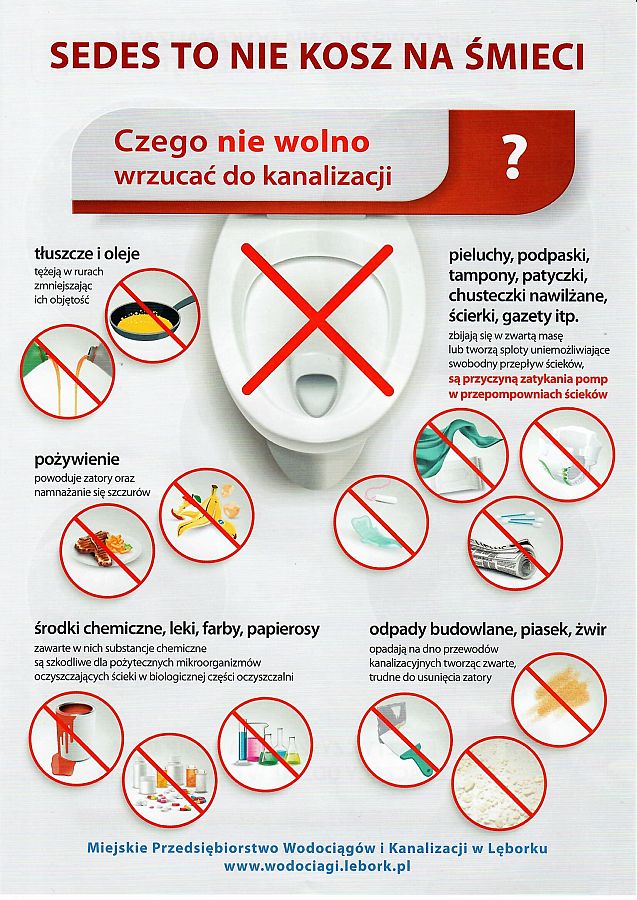 - Lekarstw, igieł, farb oraz chemikaliów innych niż powszechnie używane środki czystości, substancje chemiczne w nich zawarte są szkodliwe dla pożytecznych mikroorganizmów oczyszczających ścieki w biologicznej części oczyszczalni,