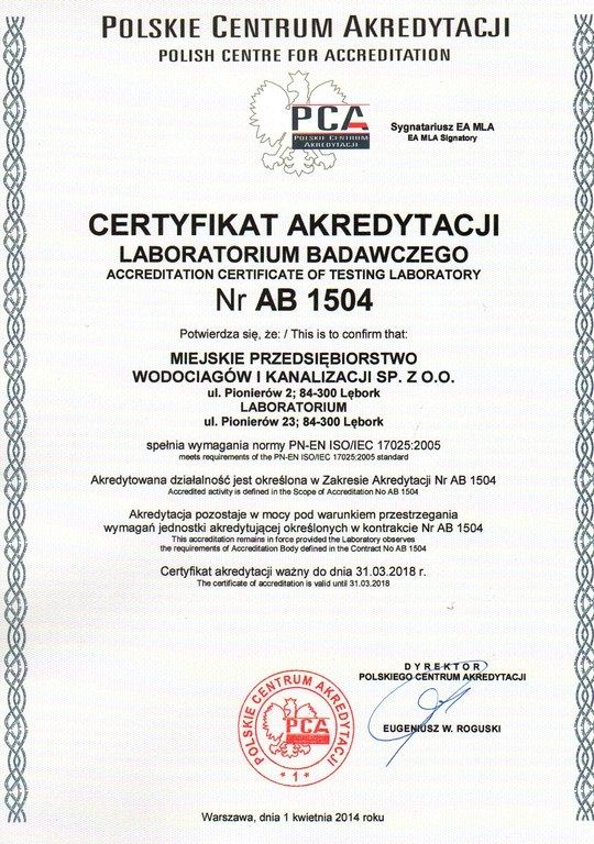 Dnia 01.04.2014 Laboratorium należące do MPWiK Sp. z o.o. w Lęborku otrzymało certyfikat akredytacji numer AB 1504 na następujące metody badawcze: