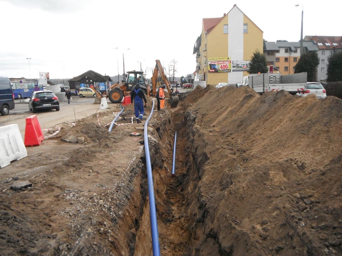 Trwają prace związane z inwestycją Lęborski Węzeł Przesiadkowy. Prace polegają na wymianie wodociągu wraz z infrastrukturą w ul. Dworcowej.