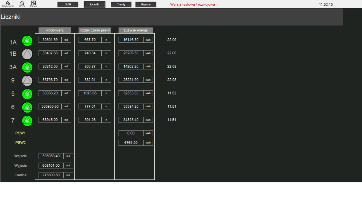 We wrześniu udało się zakończyć realizowaną siłami własnymi przedsiębiorstwa inwestycję: "Monitoring energii pomp w Dolinie Łeby przy Stacji Uzdatniania Wody MPWiK". Na każdej sekcji w rozdzielnicy zasilającej poszczególną pompę studni głębinowej zamontowano analizator energii elektrycznej umożliwiający odczyt parametrów elektrycznych pompy w czasie rzeczywistym oraz zużycia przez nią energii. Wszystkie dane pomiarowe (m.in. z siedmiu pomp) są archiwizowane i obrabiane w oprogramowaniu na potrzeby tworzenia trendów / wykresów przebiegu stanów/pracy. Ma to posłużyć do wyznaczania na bieżąco wydajności/sprawności pomp, oraz szybszemu zapobieganiu awarii. Stworzona na potrzeby inwestycji aplikacja umożliwia zdalny dostęp do najistotniejszych parametrów pracy pomp oraz Stacji Uzdatniania Wody.