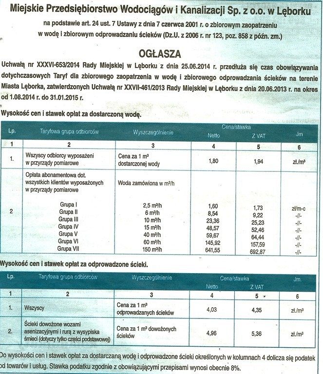 Miejskie Przedsiębiorstwo Wodociągów i Kanalizacji Sp. z o.o. w Lęborku informuje, iż Uchwałą nr XXXVI-653/2014 Rady Miejskiej został przedłużony czas obowiązywania dotychczasowych Taryf dla zbiorowego zaopatrzenia w wodę i zbiorowego odprowadzania ścieków. Taryfa ta obowiązywać będzie do 31.01.2015 roku czyli następne 6 miesięcy.