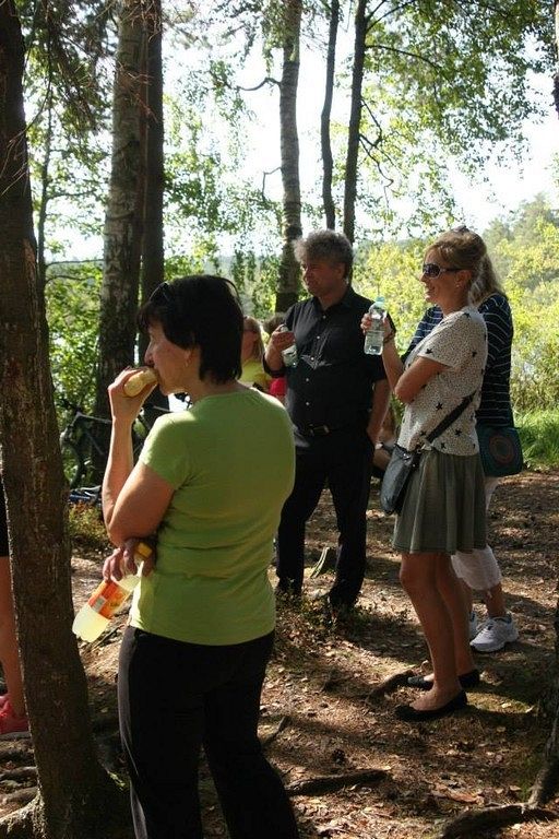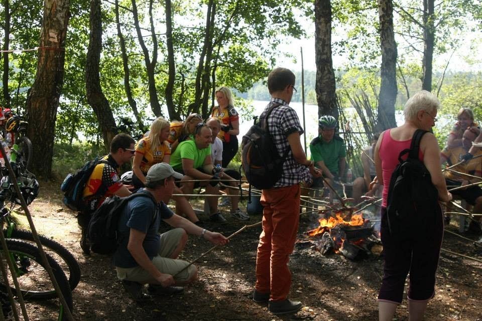 Następnie rowerzyści udali się, już z górki w stronę jeziora Osowskiego, gdzie odbyło się ognisko z ufundowanymi przez MPWiK kiełbaskami. Jak zwykle humory wszystkim dopisywały, a i słoneczko pięknie przygrzewało ;). Sporym zaskoczeniem i niespodzianką był udział w ognisku Burmistrza Lęborka Pana Witolda Namyślaka z żoną, oraz Starosty Pana Wiktora Tyburskiego.